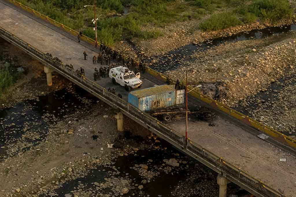 Desde el lado colombiano, los uniformados observaron cómo los guardias y varios civiles en la parte venezolana arrojaban piedras al río y limpiaban la basura que quedó en el puente tras el intento fallido de ingreso de la ayuda humanitaria al país petrolero el pasado sábado, según constató Efe.