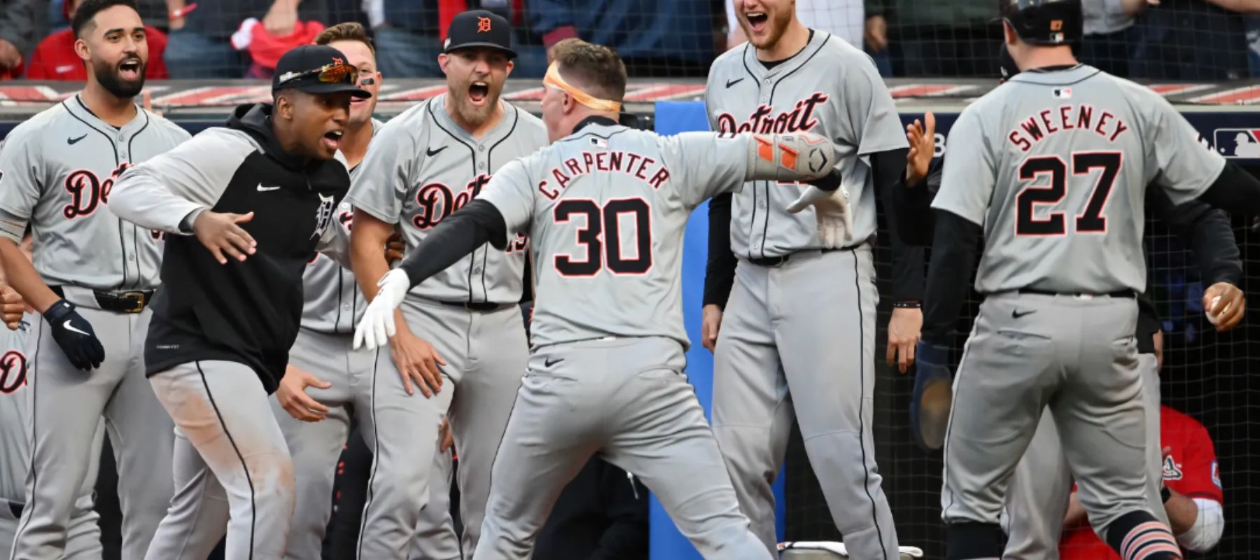 Jake Rogers bateó un sencillo con dos outs y Trey Sweeney prosiguió con otro sencillo. Carpenter, quien había ingresado al juego el inning como bateador emergente, demolió un pitcheo en cuenta de 2-2, depositando la pelota en las gradas del bosque derecho para dejar estupefactos a los fanáticos de Cleveland.