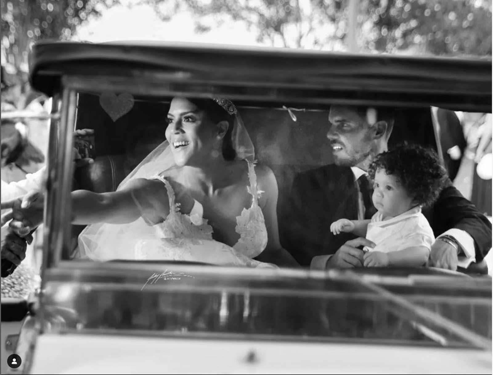 Antes de llegar al altar Francisca posa junto a su hermoso bebé Gennaro quien sorprendió a todos sus invitados desfilando en un carrito manejado a control remoto y decorado con las flores del evento.