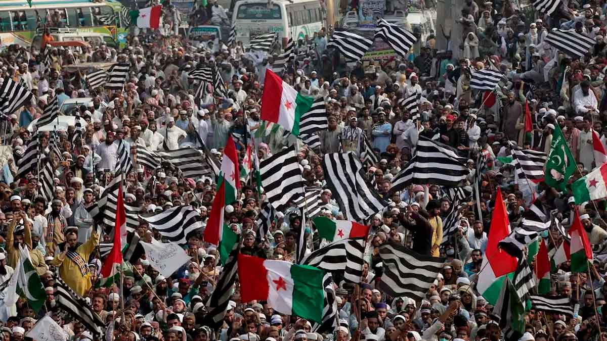 Banderas a rayas blancas y negras, símbolo JUI-F, ondeaban sobre un mar de personas, junto con los emblemas de otras formaciones opositoras, como la Liga Musulmana de Nawaz Sharif o el Partido Popular de los Bhutto, que se han unido a la protesta.