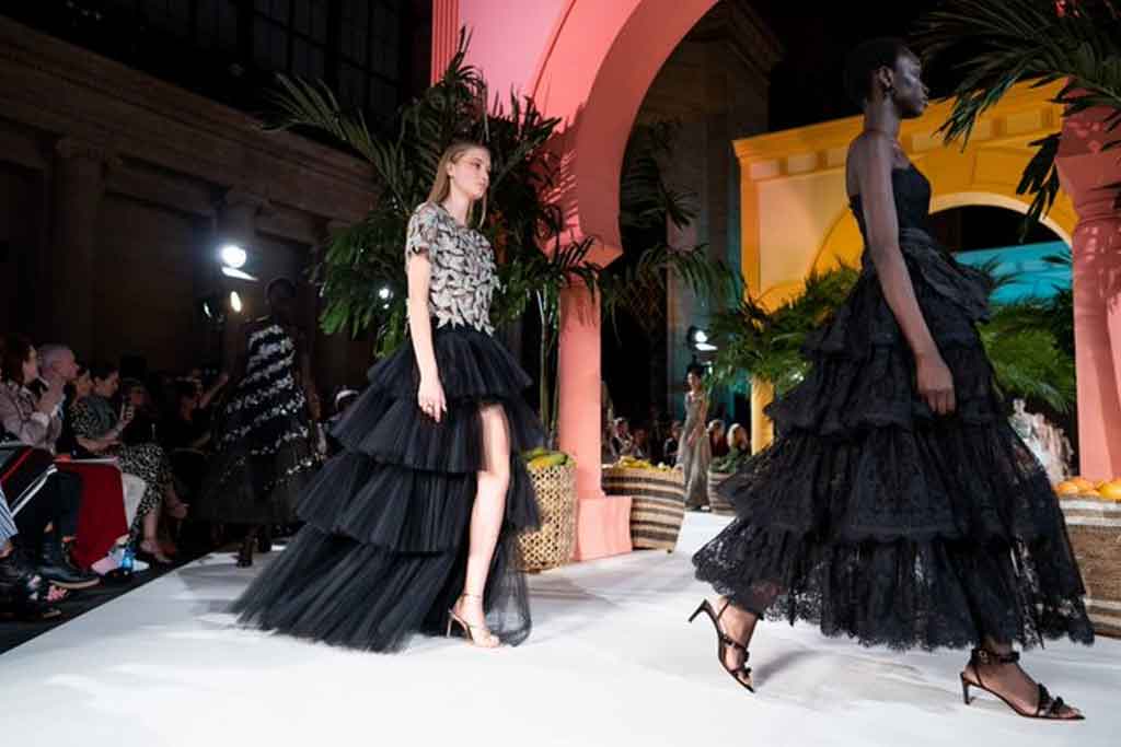 De la Renta dispuso una pasarela llena de plantas y cestos de fruta en el Cunard Building, un edificio de estilo neorenacentista en el corazón de Wall Street que hizo viajar sin moverse a sus célebres invitados hasta destinos exóticos.